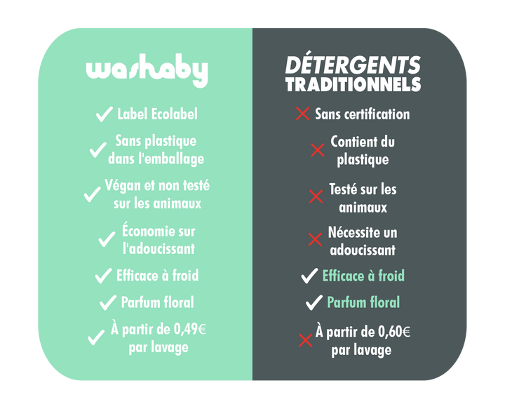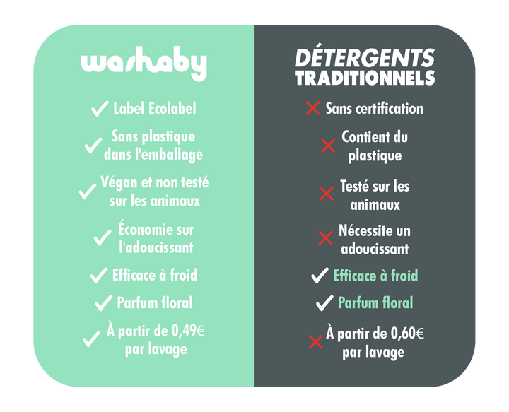 Chez Washaby, nous pensons qu'une lessive doit être efficace, prendre soin de vos vêtements, de votre peau, de la planète et de ceux d'entre nous qui y vivent. Mais... et si vous obtenez un meilleur prix que d'acheter une marque de fabricant (non éco) au supermarché, pourquoi ne vous y attendiez-vous pas ?